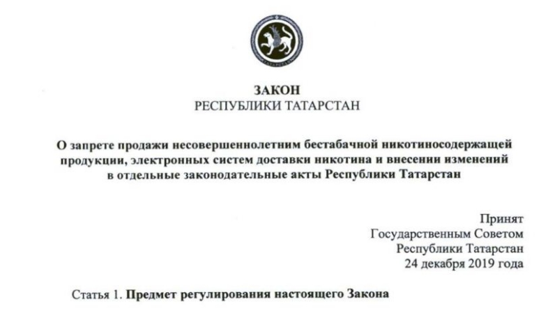 2011 года № 323-ФЗ «Об основах охраны здоровья граждан в Российской Федерации» и Федеральным законом от 24 июля 1998 года № 124-ФЗ «Об основных гарантиях прав ребенка в Российской Федерации» в целях защиты и охраны здоровья граждан устанавливает запрет продажи бестабачной никотиносодержащей продукции, электронных систем доставки никотина лицам, не достигшим восемнадцатилетнего возраста (далее – несовершеннолетние), на территории Республики Татарстан.