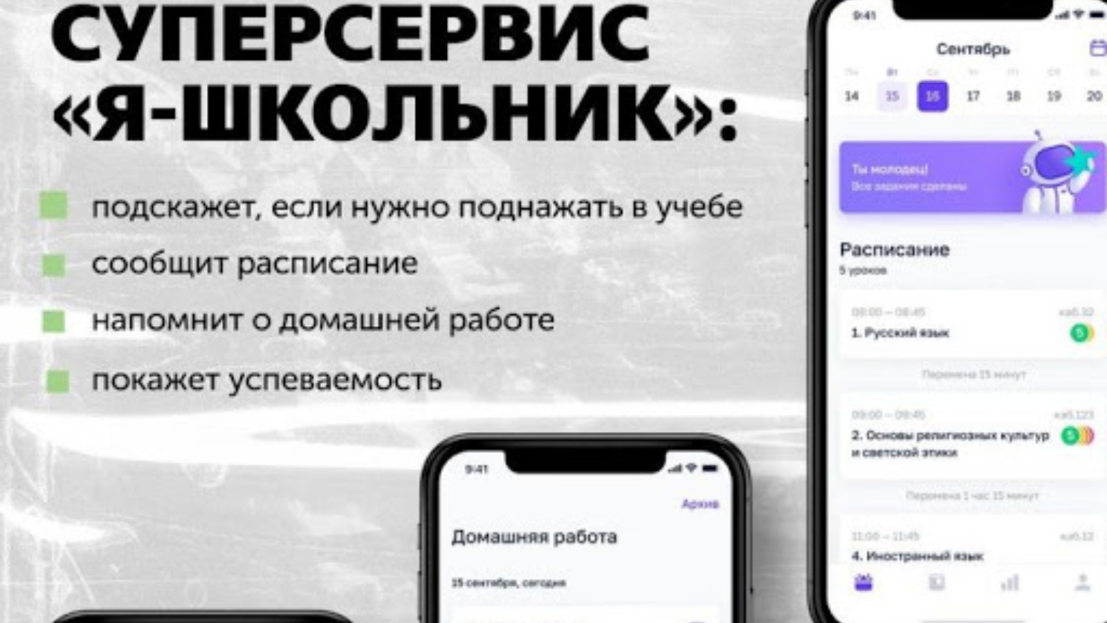 Суперсервис «Я - школьник» - это персональный цифровой помощник ребят в их учебной и внеучебной деятельности. Сервис создан по инициативе Президента Татарстана Рустама Минниханова. С его помощью ребята могут пользоваться электронным дневником edu.tatar.ru, видеть динамику своей успеваемости, а также получать подсказки о том, на какие предметы нужно направить больше внимания. Сервис помогает ученикам грамотно планировать выполнение домашних заданий, а также показывает им комментарии от учителя и сообщает о теме урока.