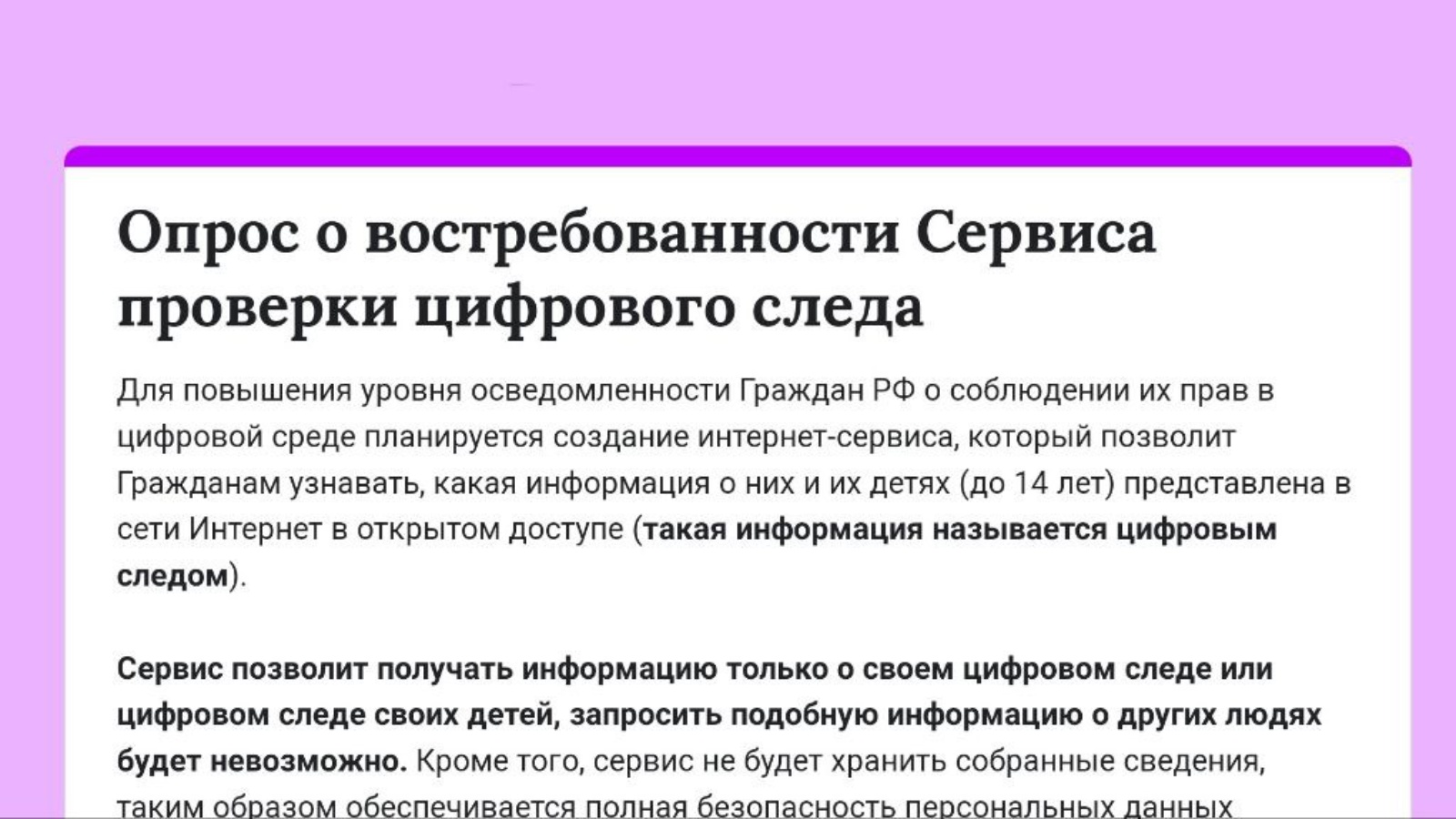👩🏻💻Интернет-сервис будет ориентирован на получение гражданином сведения только о своем цифровом следе или цифровом следе его детей.