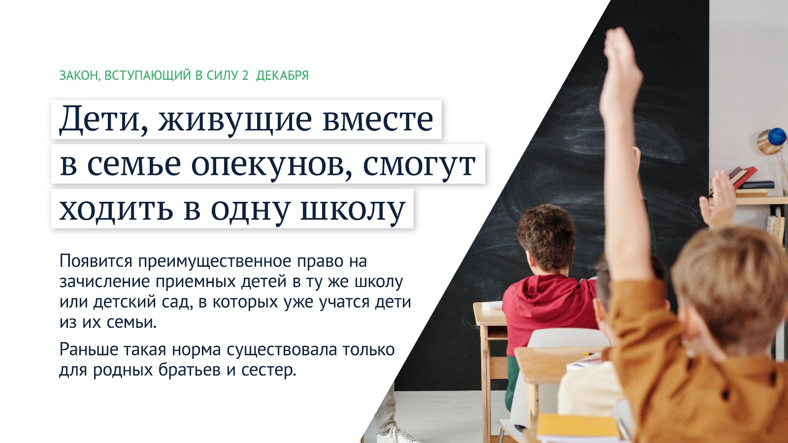 «Дети, находящиеся под опекой в одной семье, получат право на зачисление в одну и ту же школу или детский сад, — пояснил Председатель Государственной Думы Вячеслав Володин. — В настоящее время такое право есть только у братьев и сестер. А в семьях приемных родителей и опекунов чаще всего живут дети, которые не состоят друг с другом в кровном родстве. В случае принятия закона администрация будет не вправе отказаться зачислить ребенка в школу или детский сад, если в них уже ходит кто‑то из его семьи. Приемным родителям не придется рано утром развозить детей в разные места».
