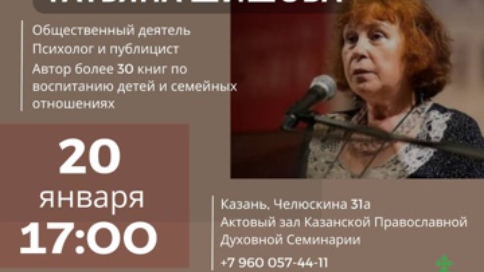 Такая возможность выпадает нечасто. Лекции Татьяны Шишовой будут проходить три дня 20 - 21 января в трёх городах республики, информация будет полезна для родителей, преподавателей общеобразовательных и Воскресных школ, священнослужителей, психологов, семейных людей, а также всех неравнодушных к теме воспитания подрастающего поколения.