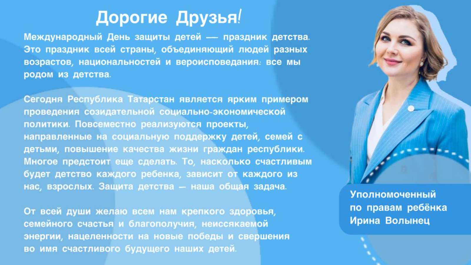 Сегодня Республика Татарстан является ярким примером проведения созидательной социально-экономической политики. Повсеместно реализуются проекты, направленные на социальную поддержку детей, семей с детьми, повышение качества жизни граждан республики. Многое предстоит еще сделать. То, насколько счастливым будет детство каждого ребенка, зависит от каждого из нас, взрослых. Защита детства – наша общая задача.